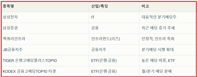 연 1회 배당하는 고배당주와 달리, 분기배당주는 매 분기마다 꾸준히 배당을 지급해 상대적으로 현금흐름이 안정적입니다. 2025년 현재 대표적인 분기배당주는 다음과 같습니다.