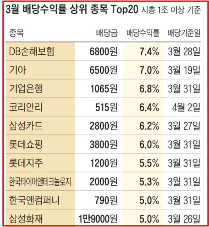 25년 3월 기준 5% 이상 고배당 종목 (시총 1조 이상)