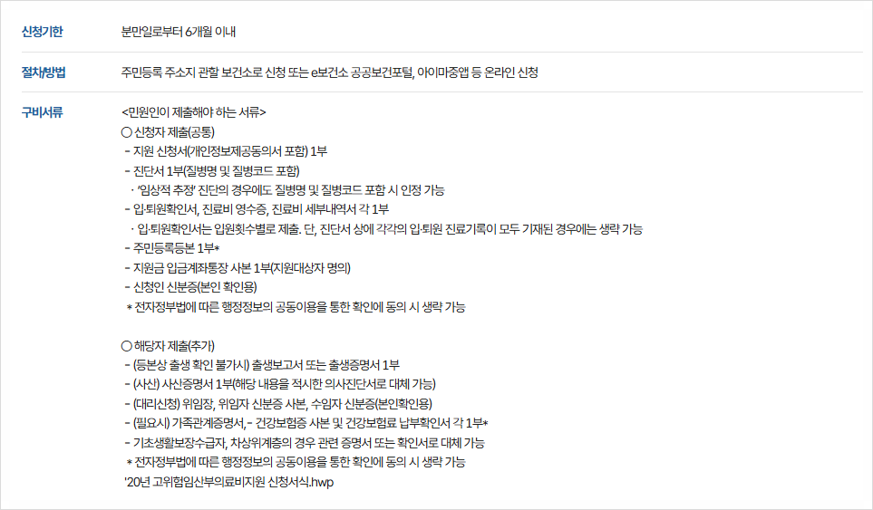 - 분만일 기준 6개월 이내 온라인(e보건소, 아이마중앱) 및 주소지 보건소 방문 모두 가능