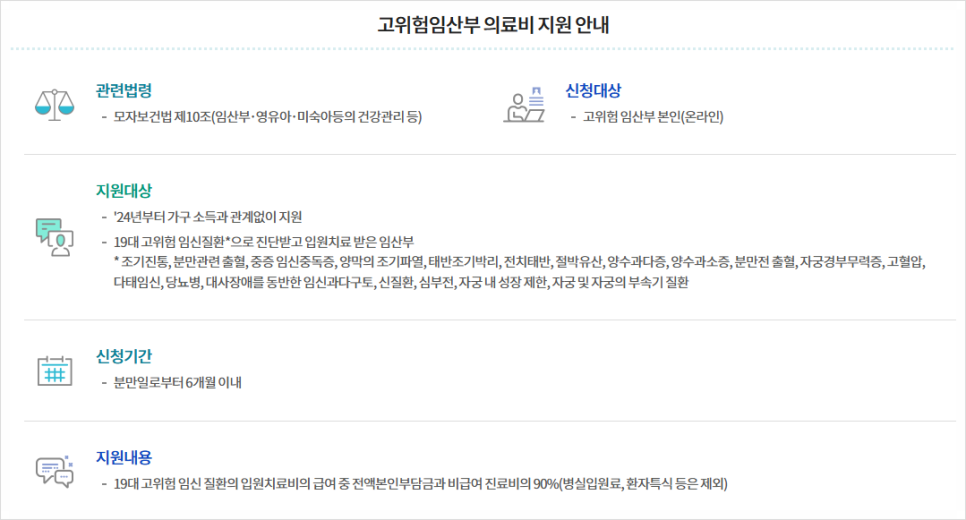 - 조기진통, 임신중독증, 전치태반, 다태임신, 자궁내성장제한 등 19대 고위험 임신질환 포함