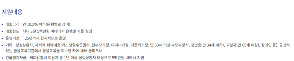 - 최대 한도 3,500만 원(1년 이상 성실 상환 시 긴급생계자금 최대 500만 원 추가 가능)