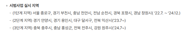 - 1단계 운영 지역: 서울 종로구, 경기 부천시, 충남 천안시, 전남 순천시, 경북 포항시, 경남 창원시