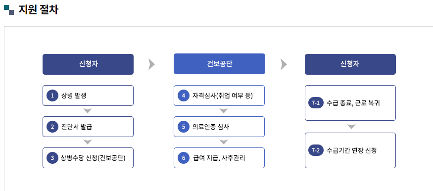 - 심사 후 지급 여부 결정 및 지정 계좌로 상병수당 지급 개시