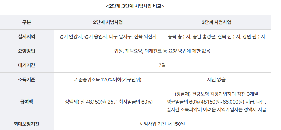 현재 상병수당은 전국적으로 시행되지 않고, 단계별 시범사업 형태로 일부 지역에서 운영되고 있습니다.