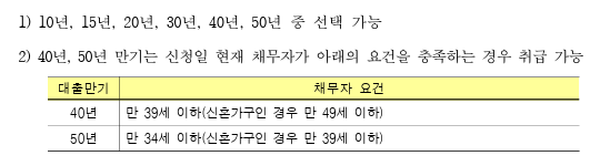 - 대출 기간: 최장 40년(만 39세 이하만 체증식 상환 선택 가능)