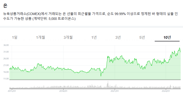 - 2015~2025년 최근 10년간 은시세는 박스권 등락 후 2023년 이후 다시 상승세